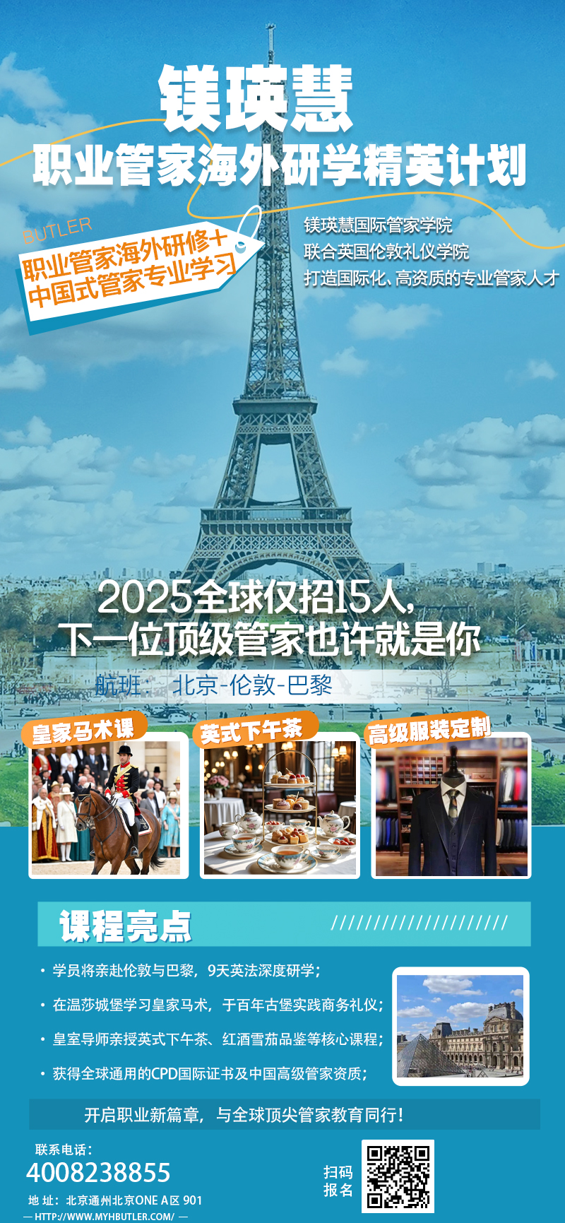 该计划的核心精髓在于“溯源”与“融合”。它带领学员亲赴现代管家文化的发源地——英国与法国,进行一场为期9天的深度研学。这绝非走马观花的旅行,而是在温莎城堡的马场上、在巴黎百年古堡的宴会厅里,进行的一场场关于品味、细节与卓越服务的实战演练。