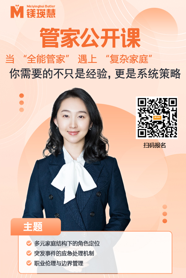 当 “全能管家” 遇上 “复杂家庭”:你需要的不只是经验,更是系统策略 —— 镁瑛慧国际管家学院免费公开课邀你解码职业核心能力 在当代高净值家庭结构日益多元、需求日趋精细的背景下,职业管家的角色早已超越传统“服务者”的范畴,成为家庭运转的协调者、生活品质的守护者,乃至家族文化的传承者。然而,面对多代同堂、跨国背景、特殊照护需求、隐私高度敏感等复杂家庭环境,职业管家如何精准应对、游刃有余?这不仅考验专业技能,更挑战情商、判断力与文化敏感度。